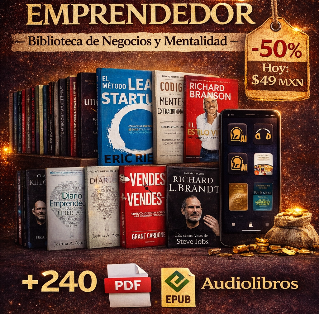 Este pack exclusivo te ofrece las herramientas y conocimientos necesarios para lanzar y hacer crecer tu negocio. Con una selección de 240 libros y 60 audiolibros de emprendimiento, tendrás todo lo que necesitas para dar forma a tus ideas, construir tu proyecto y llevarlo al siguiente nivel.