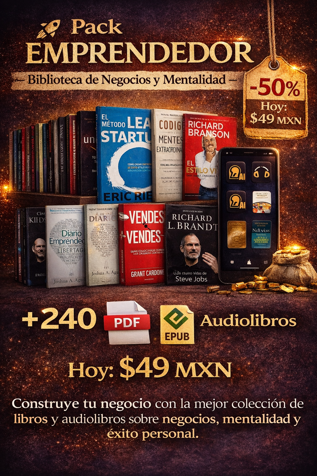 ¿Sueñas con tener tu propio negocio? Nuestro kit te proporciona las claves para alcanzar el éxito empresarial. A través de una colección cuidadosamente seleccionada de libros y audiolibros de los mejores emprendedores del mundo, aprenderás estrategias probadas, consejos prácticos y la mentalidad ganadora que necesitas para triunfar.